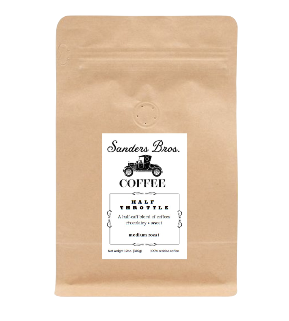 A Sanders Bros. Coffee original! Two coffees~ one a Colombia EA process decaf, the other a “roaster’s choice” specialty coffee, equally blended and balanced for a smooth, rich, flavorful half-caff to ease you on down the road!
